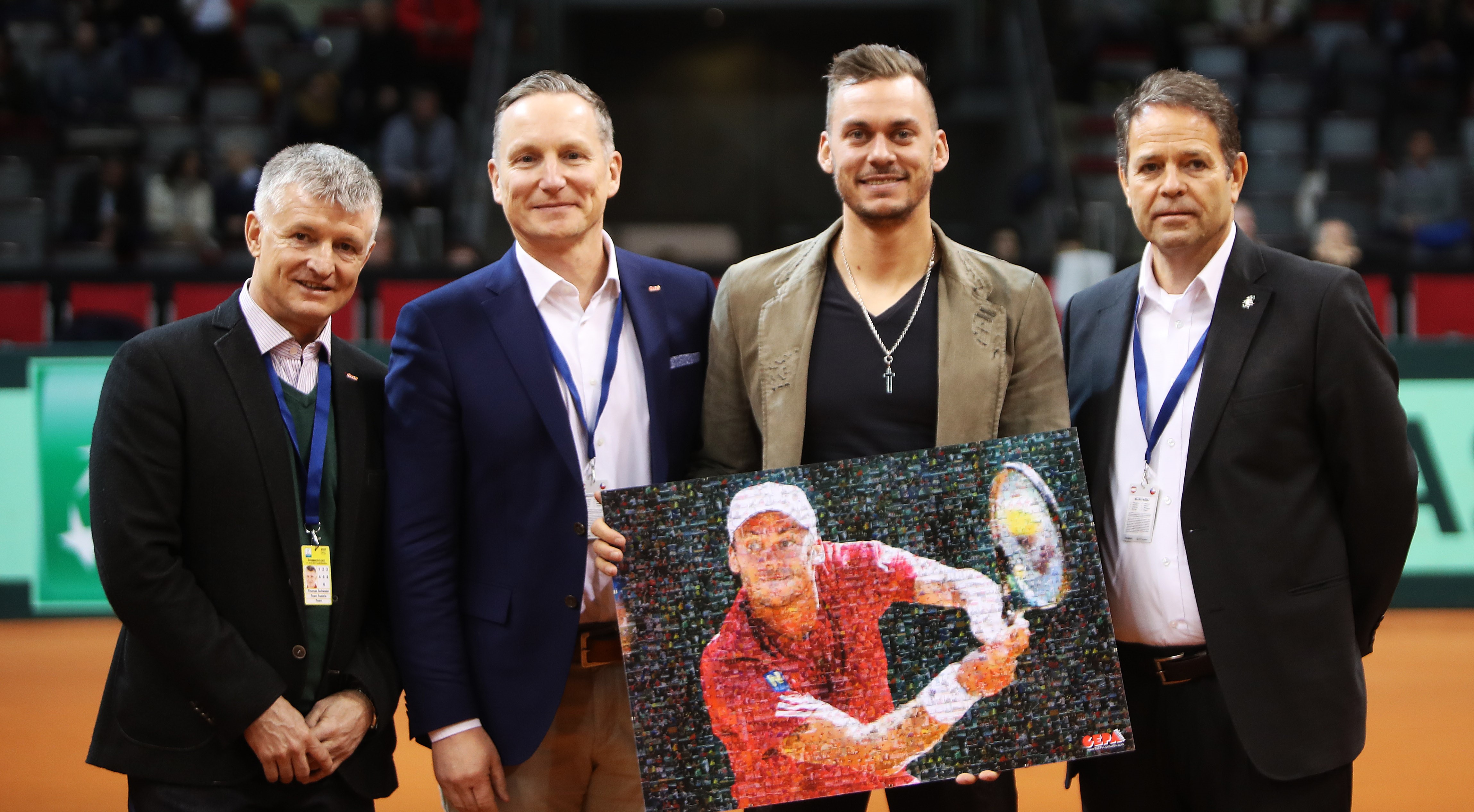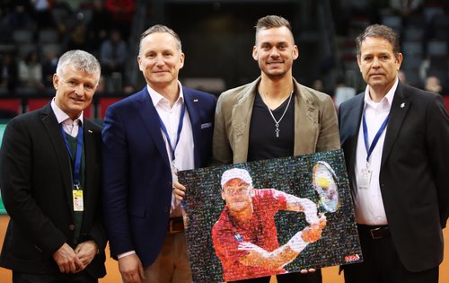 Andreas Haider-Maurer wurde am Freitag vor den Vorhang gebeten. Auf dem Center Court der SalzburgArena wurde der gebürtige Waldviertler für seine Verdienste im Daviscup geehrt. ÖTV-Präsident Werner Klausner und ÖTV-Geschäftsführer Thomas Schweda überreichten dem 31-Jährigen ein Collagen-Bild der Agentur GEPA-Pictures, auf dem die wichtigsten Momente im Teamdress abgelichtet sind. Auch der Daviscup-Fanclub stellte sich mit einem Foto-Geschenk ein.