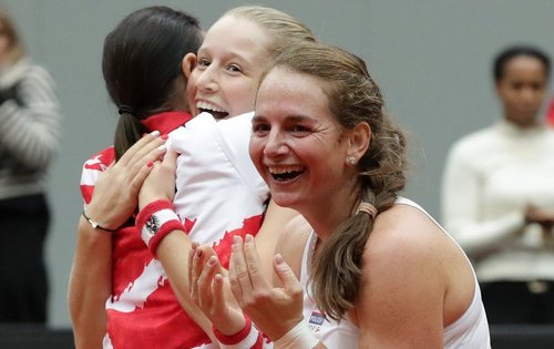 Die Überraschung ist perfekt: Das Alpstar Austria Billie Jean King Cup Team hat den Coup im Play-off gegen Lettland geschafft. Die ÖTV-Damen-Nationalauswahl setzte sich, bei ihrem ersten Heimmatch seit April 2008, vor begeisterten Fans im Multiversum Schwechat gegen die favorisierten Baltinnen knapp mit 3:2 durch. Das eingespielte Duo Melanie Klaffner und Sinja Kraus stellte hierbei im alles entscheidenden Doppel den Sieg für die Mannschaft von Kapitänin Marion Maruska sicher. Die Oberösterreicherin und die Wienerin bezwangen Diana Marcinkevica und Jelena Ostapenko nach rund 1:21 Stunden Spielzeit mit 7:5, 6:3 und sorgten für Jubelströme in Rot-weiß-rot – Sektduschen für alle Beteiligten inklusive, auch für die diesmal nicht zum Einsatz gekommene Barbara Haas, Teammasseur Werner Farmer, Physiotherapeutin Katrin Müllner und Veranstalter Florian Leitgeb von der Agentur Champ Events.